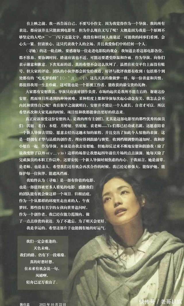 发布日期:2025-11-27 20:48 点击次数:197 10月17日晚,当天上映的电影《寻她》宣布撤档。片方公告表示,电影《寻她》将重新选择档期与观众见面。影片将于10月17日至10月19日进行点映。“在此向各位影院的同仁及所有观众朋友们致以最诚挚的歉意”。 今日,本片导演陈仕忠发布了写给观众和主创的一篇文章如下: 在上映之前,我一再告诉自己,不要写小作文。因为我觉得作为一个导演,我的所有表达,都应该并且只能放到电影里。但为什么现在又写了呢大概是因为我是一个原则不够坚定的人吧。写下这篇文字,我没有和任何人商量过。可能我的同事们看到,会心头一紧。但请放心,这只代表我个人的立场,并且我爱你们中的任何一个人。 《寻她》的这一轮点映,要感谢每一位走进电影院的观众。我知道去看这部电影各位,都不容易,要协调时间,路途应该也不近,可能还要遭受降温和冷雨。作为导演,向你们表示谢意和歉意。下次见面的话,真的希望不会这么坎坷了。虽然在社交平台上面没有账号,但大家的评论,团队的小伙伴都会转发给我看,好评与批评我都有收到(包括那个到处都有的“吃瓜罗伯特”[O·`Д·○」)。这几天真的像做梦一样,每一份善意和共情,都值得我用一生去珍藏。这可能也是一个影视工作者,能收获的最宝贵的礼物。 大家都有安慰我说,导演只应该对创作负责,市场的起伏是我所不能左右的。谢谢这份安慰。然而项目所遇到的种种困难,某种程度上都和导演每次起心动念有关,我怎么会不内耗和责怪自己呢我在很早之前就明白,安慰并不能让一个人成长,自省才可以。所以希望再次和大家见面的时候,项目组和我都能拿出更好的状态来。 真正应该接受这份安慰的人,是我的所有主创们,尤其是这部电影里的那些优秀的演员们:淇姐、老白、本煜、月婷姐、恬妞姐、袁老师....Ta们都已经功成名就,还愿意陪着一个新人导演去冒险,愿意去经历这趟未知的旅程,并且交出了如此令人惊艳的表演。这是一群拥有才华与品质的创作者,理应得到鼓励与褒奖。收到档期调整的通知时,我和舒小姐在一起。作为导演,本该是由我去安慰她。但她却反过来不断地安慰和鼓励我(除了说我变胖了以外0(T_┭)0)这样的场景让我想起四年前在片场的点点滴滴。她每天除了完成演员的本职工作以外,还要安抚一个新人导演时刻焦虑的内心。于我而言,她是前辈,是老师,也是亲人。希望我们还有机会再次合作的时候,我已经足够强大,能保护她,能保护每一位伙伴,能遮风挡雨。 我始终认为《寻她》是一部有价值的电影,也是一部值得被更多人看见的电影。感激我们的团队能有机会做这样一个项目。归根结底,作为一个从那样的环境里走出来的人,午夜梦回,那些没有名字的女孩向世界追问时,作为一个创作者,我已经在能力范围内,做了一点点珍贵的表达。为了不遗忘,为了明天会更好。 我是幸运的,希望这部片子也能拥有她的好运气。 我们一定会重逢的。天色未晚,我们的路,仍有下一段璀璨。 真的好想好想,在未来有机会说一句, 凤娣啊,轻舟已过万重山了。 陈仕忠2025年10月22日